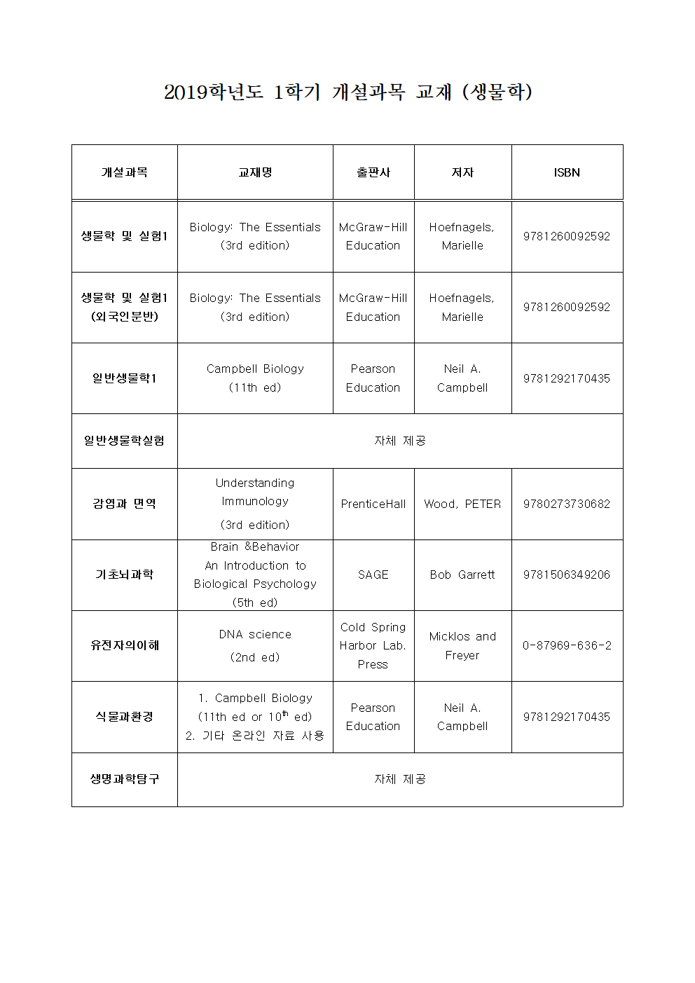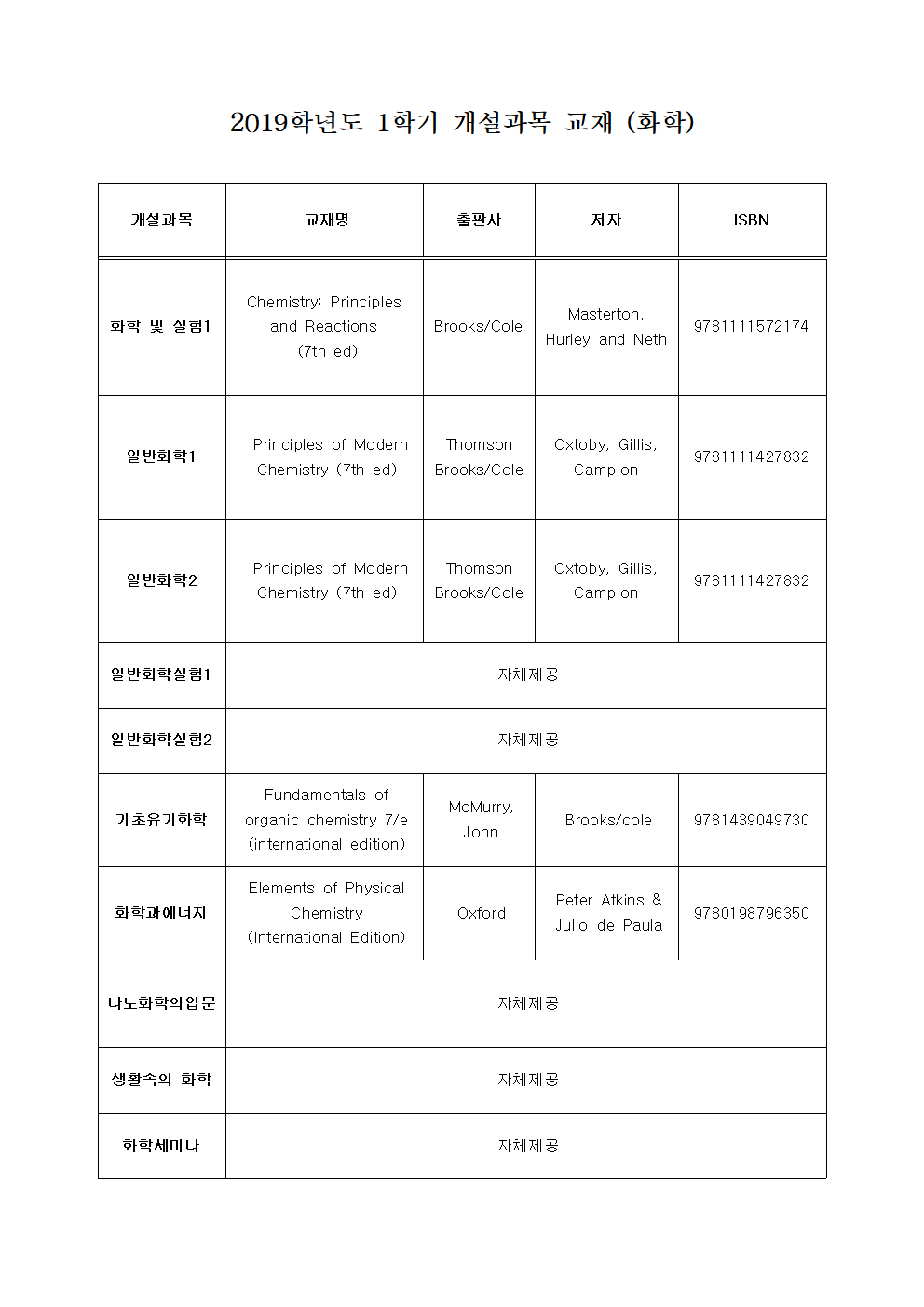 2019학년도 1학기 화학생물학부 교재 일람 관리자2019.01.25 17:05:41 조회4050 image001.png (24.3KB,219)image002.png (26.5KB,238) 목록 번호 제목 조회 42 기기교육 알림(항온항습기) 4858 41 기기교육 알림(접촉각 측정기) 2818 40 기기교육 알림(시차주사 열량 분석기) 2589 2019학년도 1학기 화학생물학부 교재 일람 4051 38 기기 교육 알림(형광분광광도계) 2287 37 2018 화학생물학부 1인 1기 운영 및 지원자 신청 2173 36 자외선-가시광선 분광광도계 기기교육안내 2436 35 2017학년도 화학생물학부 국외전문가 초청 세미나 개최 1917 34 졸업생 모교 특강 안내 (9월 1일, 금요일) 2220 33 2017학년도 2학기 화학세미나 안내(KAIST 교수 직강) 2433 32 국제 바이오.의과학 실험경연대회 개최 안내 3636 31 [시간변경]기기교육안내 - 총유기탄소분석기(TOC, Total Organic Carbon Analyzer) 2071 30 화학초청세미나 안내 (4/28, 금) 1776 29 노벨상 수상자와 대한민국 석학이 함께하는 BIO 희망나눔 프로그램 안내 2729 28 화학생물학부 진로설명회 '화생의 밤' 2383 123 제목 내용 제목+내용 이름 닉네임 아이디 검색